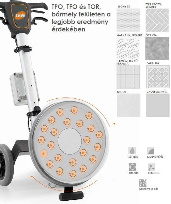 A TPO padlógépek jellemző roto-orbitális mozgása kivételes eredményeket biztosít bármilyen típusú padlón. Alkalmasak a gyakrabban használt alkalmazásokhoz, mint például a mosás vagy a mély tisztítás, a viaszmentesítés és a kristályosítás, és a szőnyegtisztításban elképesztő eredményeket garantálnak. Mindenféle kezeléshez számos tartozék áll rendelkezésre.