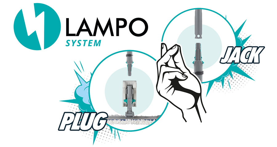 A Lampo rendszer központi elemei a Jack terminál adapter és a Plug rögzítőelem, amelyek segítségével a takarítókocsik és egyéb tisztítóeszközök könnyedén kombinálhatók. A Jack adapter biztosítja, hogy a különböző tisztítófejek stabilan rögzüljenek, így a felhasználó gyorsan és biztonságosan végezheti el a munkáját anélkül, hogy az eszközök váratlanul lecsatlakoznának.